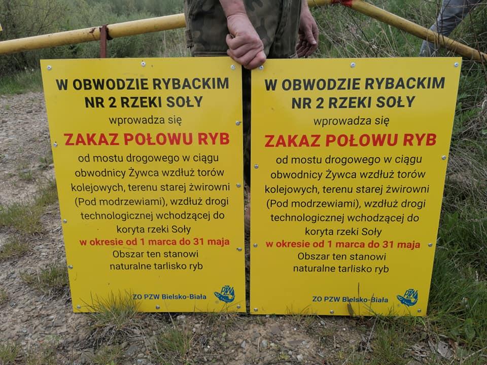 Toteż biorąc pod uwagę dobro wędkarzy i troskę, aby nie narażali się na konsekwencję i nieprzyjemności postanowiliśmy umieścić znaki informacyjne o zakazie połowu. Sprawę skonsultowaliśmy z przedstawicielem użytkownika rybackiego czyli ZO Bielsko-Biała. I teraz miejsce z zakazem połowu stało się jasne do zrozumienia, nie wolno łowić od mostu do znaku, plus "pod modrzewiami' i prawa strona, czyli tzw. stawik. Nie zależy Nam na karaniu wędkarzy, tylko na ochronie naturalnego tarliska, dlatego prosimy o uszanowanie znaków. Drodzy wędkarze, My wiemy gdzie nie wolno łowić, znaki mają służyć przede wszystkim Wam. Tym bardziej, że poświęciliśmy połowę niedzieli nosząc narzędzia i beton w workach po 25 kg 2 kilometry w jedną stronę, gdyż nie ma tam możliwości dojazdu samochodem. Cały koszt ok 500 złotych pokryliśmy z własnej kieszeni, po to aby od dziś było jasne dla Was gdzie można wędkować i abyście mogli w spokoju oddać się swojemu najpiękniejszemu hobby na świecie bez strachu o narażenie się na nieprzyjemności.