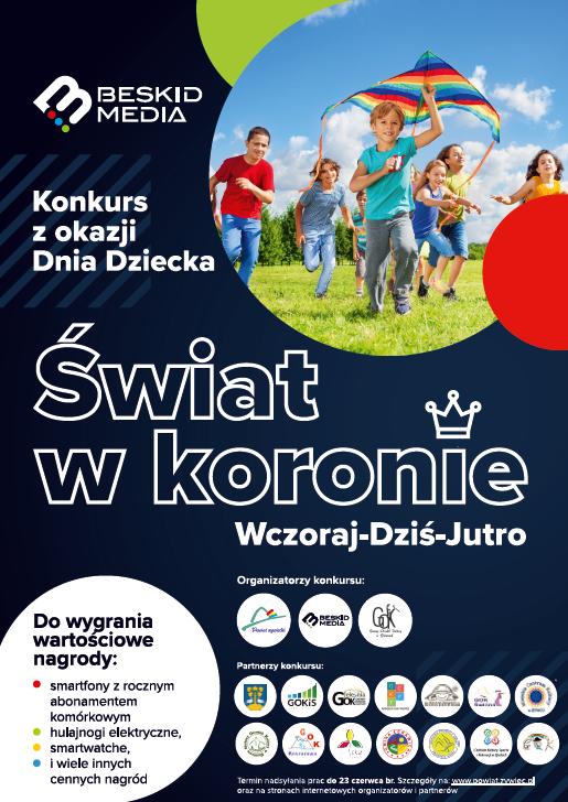 Wszystkie dzieci zapraszamy do udziału w konkursie z okazji Dnia Dziecka pt.: „Świat w Koronie. Wczoraj-Dziś-Jutro”. Konkurs jest organizowany we współpracy ze Starostwem Powiatowym w Żywcu oraz Ośrodkami Kultury z powiatu żywieckiego.