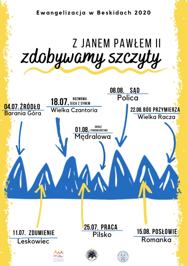 Lista zaplanowanych do zdobycia szczytów jest następująca: 4 lipca – Barania Góra („Źródło”), 11 lipca – Leskowiec („Zdumienie”), 18 lipca – Wielka Czantoria („Rozmowa Ojca z Synem”), 25 lipca – Pilsko („Praca”), 1 sierpnia – Mędralowa („Obraz i podobieństwo”), 8 sierpnia – Polica („Sąd”),15 sierpnia – Romanka („Posłowie”), 22 sierpnia –Wielka Racza („Bóg Przymierza”).