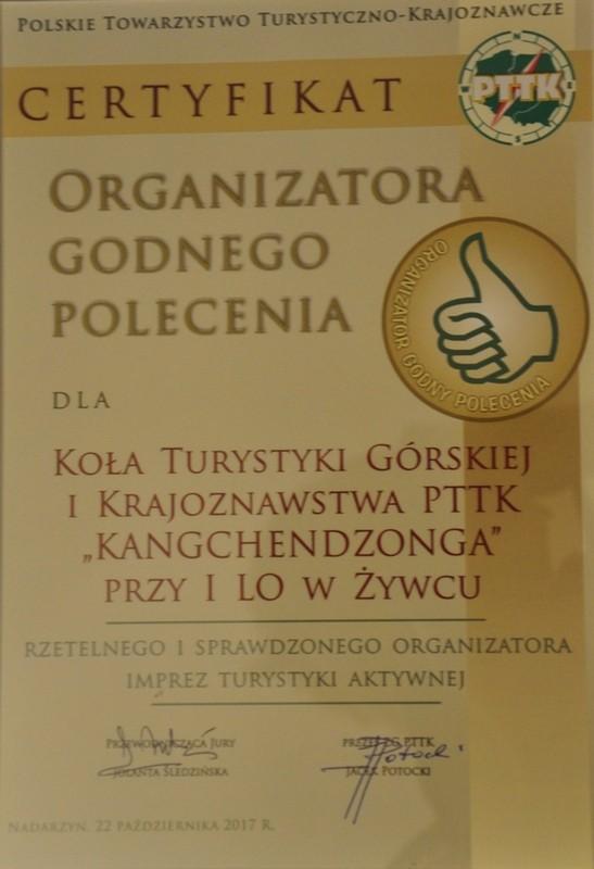 Wśród 21 organizacji, stowarzyszeń, klubów i kół z całej Polski certyfikatem zostało wyróżnione Koło Turystyki Górskiej i Krajoznawstwa Kangchendzonga PTTK przy I Liceum Ogólnokształcącym w Żywcu za organizację XX Międzynarodowej Akcji „Wędrówki z przewodnikiem” - WAKACJE 2017.