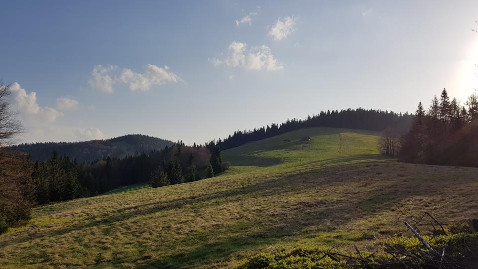 Szlak wypłaszcza się, mijamy niewielką polanę, doskonałe miejsce na odpoczynek, i znowu łagodnie wspinamy się do góry, by po niedługim czasie osiągnąć grzbiet, który znienacka wyprowadza nas na szczyt Małej Rycerzowej 1207 m n.p.m. i na przepiękną Halę z widokiem na zachodnie pasmo Beskidów, a na południu z charakterystycznym Vielkim Rozsutcem na Małej Fatrze. Do schroniska już niedaleko, ale zachęcam do wyłożenia się na trawiastych stokach hali, gdzie nie ma jeszcze zbyt wielu turystów, a  dzieci mają wspaniałą okazję do turlania się łagodnym zboczem.